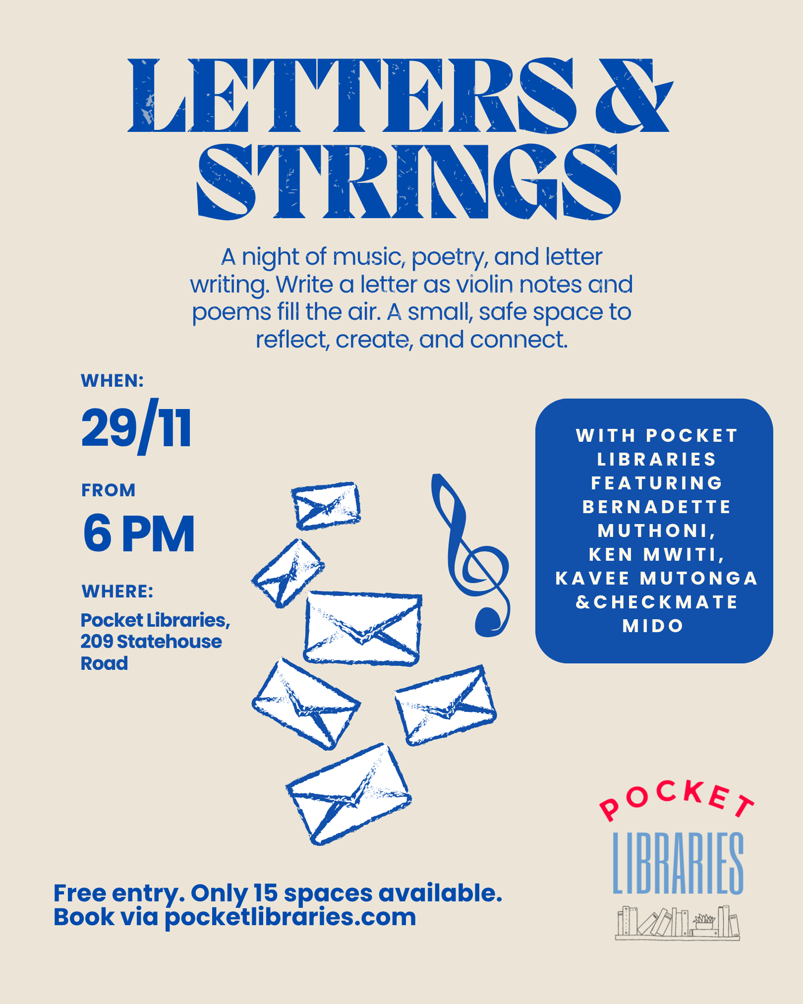 The night will feature performances and readings by Bernadette Muthoni, Ken Mwiti, Kavee Mutonga, and Checkmate Mido, alongside the Pocket Libraries community.